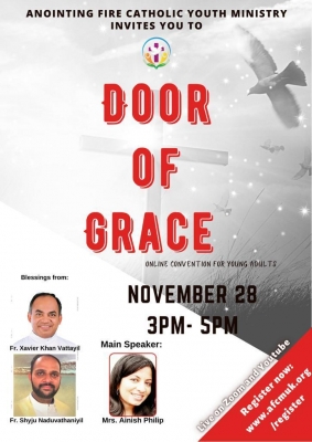 വര്ത്തമാനകാലത്തിന്റെ നന്മതിന്മകളെ വിവേചിച്ചറിയുവാന് ,നാളെയുടെ വാഗ്ദാനമായ യുവജനതയെ ക്രിസ്തുമാര്ഗത്തിന്റെ പരിശുദ്ധാത്മ വഴിത്താരയില് നയിക്കാന് ,ഓരോ ഹൃദയങ്ങളിലും ആഴമാര്ന്ന ദൈവ കരുണയുടെ വാതില് തുറക്കാന് പ്രാപ്തമാക്കുന്ന 'ഡോര് ഓഫ് ഗ്രേസ് ' അഭിഷേകാഗ്നി കാത്തലിക് യൂത്ത് മിനിസ്ട്രിയുടെ നേതൃത്വത്തിലാണ് നടക്കുക.www.afcmuk.org/register എന്ന ലിങ്കില് ഈ ശുശ്രൂഷയിലേക്ക് പ്രത്യേകം രജിസ്റ്റര് ചെയ്യേണ്ടതാണ് .