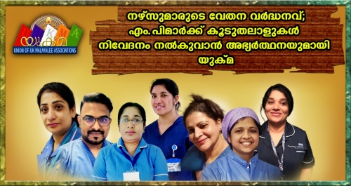 യുക്മയുടെ നേതൃത്വത്തില് നഴ്സുമാരുടെ വേതനവര്ദ്ധനവ് ഉള്പ്പെടെയുള്ള ആവശ്യങ്ങള് ഉന്നയിച്ച് ബ്രിട്ടീഷ് പാര്ലമെന്റ് അംഗങ്ങള്ക്ക് നിവേദനം നല്കിയിരുന്നതില് കൂടുതലാളുകളെ ക്ഷണിക്കുന്നു . എം.പിമാര്ക്ക് നിവേദനം നല്കുന്നതിനായുള്ള കാമ്പയ്നില് ഇതുവരെ പങ്കെടുത്തത് 480 വ്യത്യസ്ത്യ പാര്ലമന്റ് മണ്ഡലങ്ങളില് താമസിക്കുന്ന നഴ്സുമാര് ഉള്പ്പെടെയുള്ള മലയാളി ആരോഗ്യപ്രവര്ത്തകരാണ്. ബ്രിട്ടണില് ആകെയുള്ള 650 എംപിമാരില് 480 പേരിലേയ്ക്കും അതത് മണ്ഡലങ്ങളില് താമസിക്കുന്നവരെക്കൊണ്ട് തന്നെ നിവേദനം നല്കുവാന് സാധിച്ചുവെന്നുള്ള ചരിത്ര നേട്ടമാണ് യുക്മ ഇതിലൂടെ കൈവരിച്ചത്.