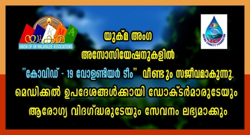 കോവിഡ് 19 ന്റെ പശ്ചാത്തലത്തില് യു കെ മൂന്നാമത്തെ 'ലോക് ഡൗണി'ല് പ്രവേശിച്ചിരിക്കുന്ന സന്ദര്ഭത്തില് എല്ലാ യുക്മ അംഗ അസോസിയേഷനുകളില് മുന്പ് രൂപം കൊടുത്ത 'കോവിഡ്19 വോളണ്ടിയര് ടീം' വീണ്ടും സജീവമാകുന്നു. ഇതിനായി എല്ലാ അംഗ അസോസിയേഷനുകള്ക്കും ആവശ്യമായ നിര്ദ്ദേശങ്ങള് ഉള്പ്പെടുന്ന ഇമെയില് യുക്മ ജനറല് സെക്രട്ടറി അയച്ച് കഴിഞ്ഞു.