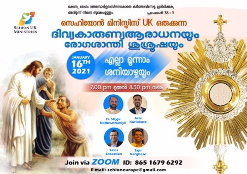 സെഹിയോന് യുകെ മിനിസ്ട്രിയുടെ നേതൃത്വത്തില് എല്ലാ മൂന്നാം ശനിയാഴ്ച്ചയും നടക്കുന്ന ദിവ്യകാരുണ്യ ആരാധനയും രോഗശാന്തി ശുശ്രൂഷയും നാളെ നടക്കും .