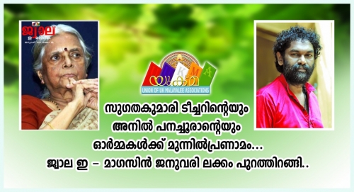 കോവിഡ് കാലത്തെ മലയാളത്തിന്റെ നഷ്ട ദുഃഖങ്ങളില് ഏറ്റവും തീവ്രമായിരുന്നു സുഗതകുമാരി ടീച്ചറിന്റെയും അനില് പനച്ചൂരാന്റെയും വേര്പാട്. ടീച്ചറിന്റെയും പനച്ചൂരാന്റെയും ദീപ്ത സ്മരണകള്ക്ക് മുന്നില് തൊഴുകൈകളോടെയാണ് ജനുവരി ലക്കം ജ്വാല ഇ മാഗസിന് പുറത്തിറങ്ങിയിരിക്കുന്നത്.