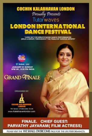 കൊച്ചിന് കലാഭവന് ലണ്ടന് സംഘടിപ്പിച്ച 'ട്യൂട്ടര് വേവ്സ് ലണ്ടന് ഇന്റര്നാഷണല് ഡാന്സ് ഫെസ്റ്റിവല്' വിജയകരമായി 12 ആഴ്ച പൂര്ത്തീകരിക്കുന്നു. 12മത് ആഴ്ച നടക്കുന്ന ഗ്രാന്റ് ഫിനാലെയില് സിനിമാതാരവും നര്ത്തകിയുമായ പാര്വതി ജയറാം മുഖ്യാതിഥിയായെത്തും. ജനുവരി 31 ഞായറാഴ്ച ഉച്ചകഴിഞ്ഞ് യു.കെ സമയംമൂന്നു മണി (ഇന്ത്യന് സമയം 8:30 പിഎം) മുതല് കലാഭവന് ലണ്ടന്റെ 'വീ ഷാല് ഓവര് കം' ഫേസ്ബുക് പേജില്ലൈവ് ലഭ്യമാകും.