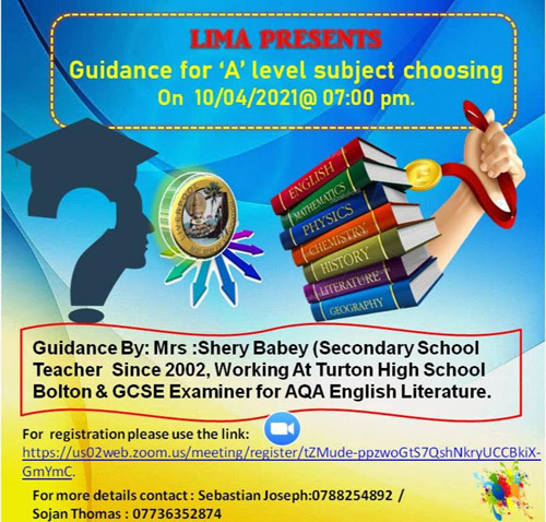 ലിവര്പൂള് മലയാളി അസോസിയേഷന് (ലിമ ) യുടെ നേതൃത്വത്തില് മാര്ച്ച് 2 ,4 , തീയതികളില് നടത്തിയ കരിയര് ഗൈഡന്സ് ക്ലാസ്സുകളില് പങ്കെടുത്ത മാതാപിതാക്കളുടെ ആവശ്യപ്രകാരം എ ലെവല് ക്ലാസുകളിലേക്ക് വിഷയം തിരഞ്ഞെടുക്കുന്നതിന് സഹായകരമാകുന്ന അറിവുലഭിക്കുന്ന ഒരു ക്ലാസ് Zoom പ്ലാറ്റ്ഫോമിലൂടെ ഇന്ന് നടത്തുന്നു.