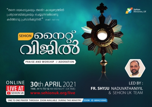 WWW.SEHIONUK.ORG/LIVE എന്ന വെബ്സൈറ്റിലും സെഹിയോന് യൂട്യൂബ് , ഫേസ്ബുക്ക് പേജുകളിലും ലൈവ് ആയി കാണാവുന്നതാണ്. ജപമാല വചന പ്രഘോഷണം, ആരാധന എന്നിവ ഉള്പ്പെടുന്ന ഏറെ അനുഗ്രഹീതമായ നൈറ്റ് വിജില് ശുശ്രൂഷകളിലേക്ക് സെഹിയോന് യുകെ മിനിസ്ട്രി യേശുനാമത്തില് ഏവരെയും ക്ഷണിക്കുന്നു.