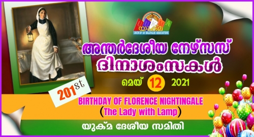 ഇന്ന് മെയ് 12 അന്താരാഷ്ട്ര നഴ്സസ് ദിനം. കോവിഡ് മഹാമാരി ലോകമൊട്ടാകെ മനുഷ്യജീവന് നാശം വിതറി മുന്നേറുമ്പോള് മുന്നണി പോരാളികളായി സ്വജീവന് പണയം വച്ചു ആതുര ശുശ്രൂഷാ രംഗത്ത് പ്രവര്ത്തിക്കുന്ന ലോകമെമ്പാടുമുള്ള മാലാഖമാര്ക്ക് യുക്മയുടെയും യുക്മ നഴ്സസ് ഫോറത്തിന്റെയും പേരില് നഴ്സസ് ദിനത്തിന്റെ ആശംസകള്.