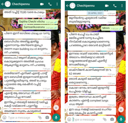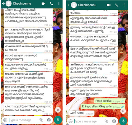 'എന്നെ ഇത്രേം അവസ്ഥയിലാക്കിയത് ഇവരാണ്..' എന്നാണു രഞ്ചു സഹോദരിക്കയച്ച വാട്സ്ആപ്പ് സന്ദേശത്തില് പറഞ്ഞത്. ആശുപത്രിയില് പ്രവേശിപ്പിച്ച ആദ്യദിവസം മരുന്ന് നല്കിയതിന് ശേഷം മൂന്ന് ദിവസം കഴിഞ്ഞാണ് ഡോക്ടര് പരിശോധയ്ക്കായി എത്തിയതെന്നും കൃത്യമായ ചികിത്സ ലഭിക്കുന്നില്ലെന്നും രഞ്ചു സഹോദരിക്ക് അയച്ച വാട്സാപ്പ് സന്ദേശത്തില് പറയുന്നു.