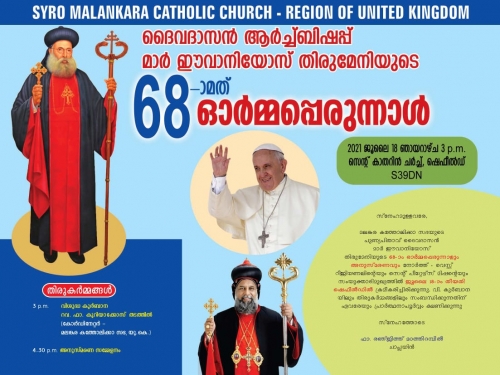 സീറോ മലങ്കര കത്തോലിക്കാ സഭ യു.കെ ദൈവദാസന് ആര്ച്ച് ബിഷപ്പ് മാര് ഇവാനിയോസ് തിരുമേനിയുടെ അറുപത്തിയെട്ടാമത് ഓര്മപ്പെരുന്നാള് ഷെഫീല്ഡ് സെന്റ്. പീറ്റേഴ്സ് മിഷനില് ജൂലൈ 18 ഞായറാഴ്ച 3PM ന് കൊണ്ടാടുന്നു. സീറോ മലങ്കര കത്തോലിക്കാ സഭയുടെ പുണ്യ പിതാവ് ദൈവദാസന് മാര് ഇവാനിയോസ് തിരുമേനിയുടെ ഓര്മത്തിരുന്നാളിന് സീറോ മലങ്കര കത്തോലിക്കാ സഭ യു കെ റീജണിന്റെ കോര്ഡിനേറ്റര് റവ.ഡോ. കുര്യാക്കോസ് തടത്തില് വി.കുര്ബ്ബാനയ്ക്ക് മുഖ്യകാര്മികത്വം വഹിക്കുന്നതാണ്. തുടര്ന്ന് 4.30 PM ന് അനുസ്മരണ സമ്മേളനവും ഉണ്ടായിരിക്കുന്നതാണ്.