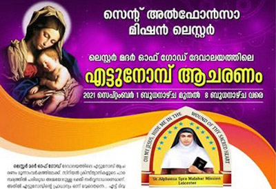 എട്ട് നോയമ്പ് ആചരണവും നൊവേനയും ലെസ്റ്ററിലെ മദര് ഓഫ് ഗോഡ് ഇടവകാ സമൂഹവും സെന്റ് അല്ഫോന്സാ സീറോ മലബാര് മിഷനും സംയുക്തമായി ആചരിക്കുന്നു. സെപ്റ്റംബര് 1 മുതല് 8 വരെ മദര് ഓഫ് ഗോഡ് ദേവാലയത്തില് എല്ലാ ദിവസവും രാവിലെ 10 മണിക്ക് ഇംഗ്ലീഷ് കുര്ബാനയും വൈകുന്നേരം 5.45 ന് മലയാളം കുര്ബാനയും ഉണ്ടായിരിക്കുന്നതാണ്.ഞായര് ദിവസം പതിവ് പോലുള്ള കുര്ബാന സമയം ക്രമീകരിച്ചിരിക്കുന്നു. സെപ്റ്റംബര് 11 ന് ഉച്ചകഴിഞ്ഞു പ്രധാന തിരുനാള് ആഘോഷം 3 മണിക്ക് ആരംഭിക്കുന്നതായിരിക്കും.