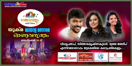 ലോകത്തിലെ ഏറ്റവും വലിയ പ്രവാസി മലയാളി ദേശീയ സംഘടനയായ യുക്മയും മലയാള മനോരമയും ചേര്ന്ന് സംഘടിപ്പിക്കുന്ന ഓണാഘോഷ പരിപാടി 'ഓണവസന്തം 2021' സെപ്റ്റംബര് 26 ഞായറാഴ്ച ഓണ്ലൈന് പ്ളാറ്റ്ഫോമിലൂടെ പ്രക്ഷേപണം ചെയ്യുന്നു.
