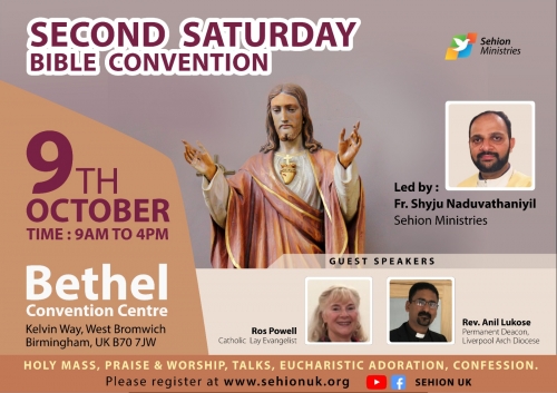 ബര്മിംങ്ഹാം: പരിശുദ്ധ ദൈവമാതാവിനോടുള്ള ജപമാല ഭക്തിയെ ആദരപൂര്വ്വം ഏറ്റുപറഞ്ഞുകൊണ്ട് ഒക്ടോബര്മാസ രണ്ടാം ശനിയാഴ്ചകണ്വെന്ഷന് 9. ന് ബഥേല് സെന്റെറില് നടക്കും. സെഹിയോന് യുകെ യുടെ ആത്മീയ നേതൃത്വം ഫാ.ഷൈജു നടുവത്താനിയില് കണ്വെന്ഷന് നയിക്കും.