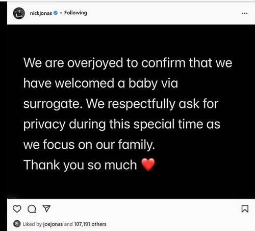 'വാടക ഗര്ഭപാത്രം വഴിയാണ് ഞങ്ങള് ഒരു കുഞ്ഞിനെ സ്വീകരിച്ചതെന്ന് സ്ഥിരീകരിക്കുന്നതില് ഞങ്ങള്ക്ക് അതിയായ സന്തോഷമുണ്ട്. ഞങ്ങളുടെ കുടുംബത്തില് ശ്രദ്ധ കേന്ദ്രീകരിക്കുമ്പോള് ഈ പ്രത്യേക സമയത്ത് ഞങ്ങള് സ്വകാര്യത ആവശ്യപ്പെടുന്നു. വളരെ നന്ദി ' ജോഡി കുറിച്ചു.