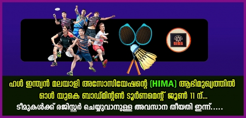 യോര്ക് ഷെയര് & ഹംമ്പര് റീജിയണിലെ പ്രമുഖ മലയാളി അസോസിയേഷനുകളിലൊന്നായ ഹള് ഇന്ത്യന് മലയാളി അസോസിയേഷന് സംഘടിപ്പിക്കുന്ന ഓള് യുകെ ബാഡ്മിന്റണ് ടൂര്ണമെന്റ് ജൂണ് 11 ശനിയാഴ്ച നടക്കും. മത്സരം രാവിലെ 11മണിക്ക് ആരംഭിക്കും. യുകെയിലെ പ്രമുഖരായ ബാഡ്മിന്റന് ടീമുകള് തമ്മില് മത്സരത്തില് മാറ്റുരയ്ക്കുന്നു.