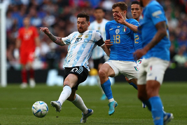 യൂറോപ്യന് ഫുട്ബോളിന് ലാറ്റിനമേരിക്കന് ചെക്ക് പറഞ്ഞു മെസിയും പിള്ളേരും. കോപ്പാ അമേരിക്കാ ചാമ്പ്യന്മാരും യൂറോ കപ്പ് ജേതാക്കളും തമ്മില് 29 വര്ഷത്തിനുശേഷം ഏറ്റുമുട്ടിയ 'ഫൈനലിസിമ' ഫൈനലില് ഏകപക്ഷീയമായ മൂന്ന് ഗോളിന് അര്ജന്റീന ഇറ്റലിയെ തകര്ത്തുവിട്ടു. മല്സരത്തില് അര്ജന്റീനയുടെ പൂര്ണ്ണ മേധാവിത്തമാണ് കണ്ടത്. ലൗട്ടാരോ മാര്ട്ടിനസ് (28), എയ്ഞ്ചല് ഡി മരിയ (45 + 1 ), ഡിബാല (90+4) എന്നിവരാണ് അര്ജന്റീനക്കായി വല ചലിപ്പിച്ചത്. ഒരു ഗോള് അടിക്കുകയും ഒരു ഗോളിന് വഴിവെക്കുകയും ചെയ്ത മാര്ട്ടിനസും , രണ്ട് ഗോളിന് വഴിയൊരുക്കിയ ലയണല് മെസിയുമാണ് അസൂറികളെ തകര്ത്തത്.