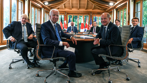 യുക്രൈന് തലസ്ഥാനത്തു പുടിന് ബോംബിട്ട ദിവസം തന്നെ റഷ്യക്കെതിരെ പുതിയ സഹകരണം പ്രഖ്യാപിച്ച് ജി7 നേതാക്കള്. ജര്മനിയില് ചേര്ന്ന ജി7 യോഗത്തിലാണ് ഏഴ് പ്രധാന ലോകശക്തികള് ഇക്കാര്യം തീരുമാനിച്ചത്. ഫ്രഞ്ച് പ്രസിഡന്റ് ഇമ്മാനുവല് മാക്രോണും റഷ്യക്കെതിരെ നിലപാട് സ്വീകരിച്ചു.