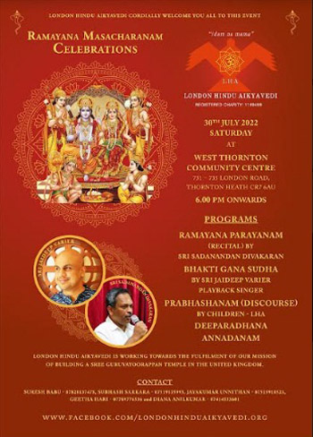 ഈ വര്ഷത്തെ രാമായണ മാസാചരണ ആഘോഷങ്ങളിലേക്ക് എല്ലാ ഭക്തജനങ്ങളായ സഹൃദയരേയും ലണ്ടന് ഹിന്ദു ഐക്യവേദി സംഘാടകര് സ്വാഗതം ചെയ്തു.