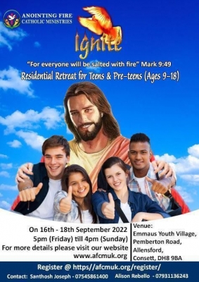 അഭിഷേകാഗ്നി കാത്തലിക് മിനിസ്ട്രിയുടെ നേതൃത്വത്തില് കുട്ടികള്ക്കും ടീനേജുകാര്ക്കുമായി (9വയസ്സുമുതല് 18 വരെ) 3 ദിവസത്തെ ധ്യാനം സെപ്റ്റംബര് 16 മുതല് 18 വരെ അലെന്സ്ഫോര്ഡ് എമ്മാവൂസ് യൂത്ത് വില്ലേജില് വച്ച് നടക്കുന്നു.