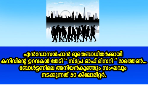 ദുരിതത്തിന്റെ തീരാക്കയങ്ങളില് വീണ് ജീവിതം നരകതുല്യമായി തള്ളി നീക്കുന്ന കാസര്കോട്ടെ എന്ഡോസള്ഫാന് ബാധിതരെ സഹായിക്കുവാനായി യുകെയിലെ ഒരു കൂട്ടം മനുഷ്യസ്നേഹികള് മുന്നോട്ട് വരികയാണ്. കാസര്കോട്ടെ കൃഷിയിടങ്ങളില് യാതൊരു നിയന്ത്രണവുമില്ലാതെ ഉപയോഗിച്ച എന്ഡോസള്ഫാന് എന്ന മാരക കീടനാശിനി സൃഷ്ടിച്ച അതീവ ഗുരുതരമായ ആരോഗ്യ പ്രശ്നങ്ങള്ക്കും പാരിസ്ഥിതിക പ്രശ്നങ്ങള്ക്കും ഇരയായവര് ഏറെയാണ്. അംഗവൈകല്യങ്ങളോടെ പിറന്ന് വീണ കുഞ്ഞുങ്ങള്, ഗുരുതരമായ ക്യാന്സര് രോഗബാധിതര്, ശ്വാസകോശ രോഗങ്ങള് ബാധിച്ചവര് എന്നിങ്ങനെ നൂറുകണക്കിനാളുകള് തീരാ ദുരിതത്തില് ജീവിക്കുകയാണ്. ഇവര്ക്കൊരു ചെറിയ സഹായമെങ്കിലും എത്തിക്കുവാനുള്ള ഒരു കൂട്ടം മനുഷ്യസ്നേഹികളുടെ മനസ്സിലുദിച്ച ആശയമാണ് 'സ്പ്രേ ഓഫ് മിസറി' എന്ന് പേരിട്ടിരിക്കുന്ന 50 കിലോമീറ്റര് (32 മൈല്) മാരത്തണ് നടത്തം. ബ്ളാക്ക്ബേണിനടുത്ത് ക്ളെയ്റ്റണ് ലെ മൂര്സില് നിന്നും വിഗണ് പിയര് (ലീഡ്സ് ലിവര്പൂള് കനാല്) വരെയുള്ള 50 കിലോമീറ്റര് മാരത്തണിലൂടെ ഇവര് ശേഖരിക്കുന്ന പണം എന്ഡോസള്ഫാന് ദുരിതബാധിതര്ക്ക് ഒരു ചെറിയ സഹായമാകും എന്ന പ്രതീക്ഷയിലാണ് ഈ മനുഷ്യസ്നേഹികള്.