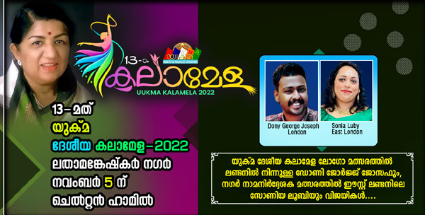 ചെല്റ്റന്ഹാമില് നടക്കുന്ന പതിമൂന്നാമത് യുക്മ ദേശീയ കലാമേള നഗര് നാമനിര്ദ്ദേശക, ലോഗോ മത്സരങ്ങളുടെ വിജയികളെ യുക്മ ദേശീയ നേതൃത്വം പ്രഖ്യാപിച്ചു. യു കെ മലയാളികള്ക്കിടയില് നടത്തിയ നഗര് നാമനിര്ദ്ദേശക മത്സരത്തില് നിരവധിയാളുകള് ആവേശപൂര്വ്വം പങ്കെടുത്തു. നിരവധി പേരുകള് നിര്ദ്ദേശിക്കപ്പെട്ടുവെങ്കിലും എട്ട് പതിറ്റാണ്ടിലധികം ഇന്ത്യന് സംഗീത ലോകത്ത് ചക്രവര്ത്തിനിയായി വിരാജിച്ച അതുല്ല്യ സംഗീത പ്രതിഭ മണ്മറഞ്ഞ 'ലത മങ്കേഷ്കര്' ന്റെ പേരാണ് കലാമേള നഗറിന് വേണ്ടി തിരഞ്ഞെടുക്കപ്പെട്ടത്.