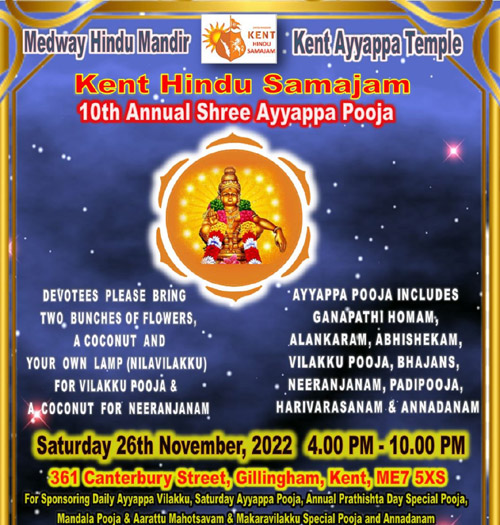 കെന്റ് ഹിന്ദു സമാജം തുടര്ച്ചയായ പത്താം വര്ഷവും അയ്യപ്പ പൂജ നടത്തുന്നു. കെന്റ് അയ്യപ്പക്ഷേത്രത്തിലാണ് അയ്യപ്പ പൂജ നാളെ (ശനിയാഴ്ച) വൈകുന്നേരം 4 മണി മുതല് 10 മണി വരെ നടത്തപ്പെടുന്നത്.
