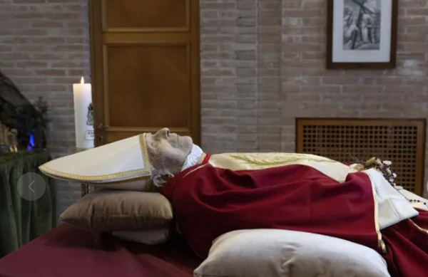 ബിഷപ്പിന്റെ തലപ്പാവും, വസ്ത്രവും, ചുവപ്പ് മേലാടയും അണിയിച്ച ഭൗതീകശരീരത്തില്, കൈകളില് റോസറിയും വെച്ചിട്ടുണ്ട്. പോപ്പ് ബെനഡിക്ട് പതിനാറാമന്റെ സംസ്കാരവും ലളിതമായിരിക്കുമെന്ന് വത്തിക്കാന് വ്യക്തമാക്കി. മുന് പോപ്പിന്റെ ആഗ്രഹപ്രകാരമാണിത്. നിരവധി ലോകനേതാക്കള് പോപ്പ് ബെനഡിക്ട് പതിനാറാമന്റെ വിയോഗത്തില് ദുഃഖം രേഖപ്പെടുത്തി. ചാള്സ് രാജാവ് ഫ്രാന്സിസ് മാര്പാപ്പയ്ക്ക് ദുഃഖം അറിയിച്ച് കത്തയച്ചിരുന്നു.