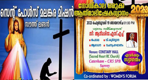 ക്രോയ്ഡോണ്: ക്രോയ്ഡോണ് സെന്റ് പോള്സ് മലങ്കര കത്തോലിക്കാ ദേവാലയത്തില് ഈ വര്ഷത്തെ നോമ്പുകാല ഒരുക്കധ്യാന ശുശ്രൂഷകള് 19ന് ഉച്ചയ്ക്ക് ഒരു മണിക്ക് ഇടവക വികാരി ഫാ. കുര്യാക്കോസ് തിരുവാലിന്റെ മുഖ്യകാര്മികത്വത്തില് കേറ്റര് ഹാം ഓണ് ദി ഹില് സെനിട്ടറി ഹാളില് നടത്തപ്പെടുന്നു.