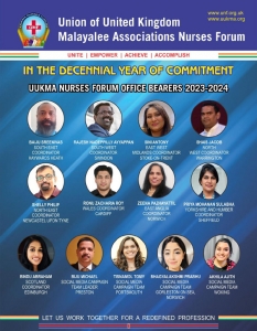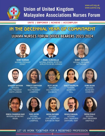സൂര്യനസ്തമിക്കാത്ത ബ്രിട്ടീഷ് സാമ്രാജ്യത്തിന്റെ ഹൃദയമായ യുകെയില് 2000 മുതല് ആരംഭിച്ച ഇന്ത്യന് നഴ്സ്മാരുടെ കുടിയേറ്റചരിത്രത്തില് ആര്ക്കും അവഗണിക്കാനാവാത്ത ഒരു സമൂഹമായി മാറിക്കൊണ്ടിരിക്കുകയാണ് മലയാളി നഴ്സ്മാര്. അവരുടെ അവകാശ സംരക്ഷണത്തിനും സമഗ്ര പുരോഗതിക്കുമായി പ്രവര്ത്തിച്ച് വരുന്ന യുക്മ നഴ്സസ് ഫോറത്തിന്റെ ശതാബ്ദിവര്ഷത്തില്, വിവിധ നേഴ്സിംഗ് മേഖലകളിലായി പ്രവൃത്തി പരിചയവും സംഘാടക മികവും തെളിയിച്ച, യുകെയുടെ വിവിധ ഭാഗങ്ങളില് നിന്നുള്ള കരുത്തുറ്റ സംഘടന പ്രവര്ത്തകര് ഉള്പ്പെടുന്ന പുതിയ നേതൃനിരയെ യുക്മ (UUKMA) നേതൃത്വം പ്രഖ്യാപിച്ചു.