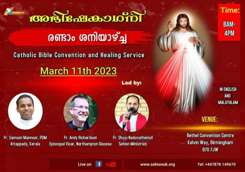 മാര്ച്ച് മാസ അഭിഷേകാഗ്നി രണ്ടാം ശനിയാഴ്ച ബൈബിള് കണ്വെന്ഷന് 11 ന് ബര്മിങ്ഹാം ബെഥേല് കണ്വെന്ഷന് സെന്റെറില് നടക്കും. പ്രമുഖ വചന പ്രഘോഷകനായ അട്ടപ്പാടി സെഹിയോന് ധ്യാനകേന്ദ്രത്തിലെ ഫാ സാംസണ് മണ്ണൂര് PDM കണ്വെന്ഷനില് ശുശ്രൂഷ നയിക്കും . നോര്ത്താംപ്ടണ് രൂപതയുടെ എപ്പിസ്കോപ്പല് വികാരി ഫാ ആന്ഡി റിച്ചാര്ഡ്സണ് AFCM യുകെയുടെ ആത്മീയ പിതാവ് ഫാ. ഷൈജു നടു വത്താനിയിലിനൊപ്പം കണ്വെന്ഷനില് പങ്കെടുക്കും .
