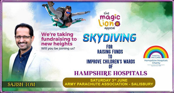 ഹാംഷെയര് ഹോസ്പിറ്റല്സ് ചാരിറ്റിയുടെ ഈ വര്ഷത്തെ സുപ്രധാന പ്രോഗ്രാം ആയ 'മാജിക് ലയണ് അപ്പീല്' ന്റെ ഭാഗമായാണ് സ്കൈ ഡൈവിങ് ആസൂത്രണം ചെയ്തിരിക്കുന്നത്. വിഞ്ചസ്റ്റര്, ബേസിംഗ്സ്റ്റോക്ക്, ആന്ഡോവര്, ഓള്ട്ടണ് ആശുപത്രികളിലെ കുട്ടികളുടെ വാര്ഡുകള്ക്ക് വേണ്ടിയാണ് സ്കൈ ഡൈവിങ് വഴി സമാഹരിക്കുന്ന തുക പ്രധാനമായും ഉപയോഗിക്കപ്പെടുക.