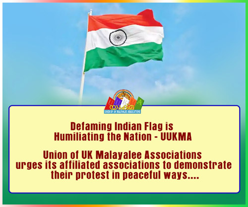 ലോകത്തെ ഏറ്റവും വലിയ ജനാധിപത്യ രാജ്യമായ ഇന്ത്യയുടെ ദേശീയ പതാക ലണ്ടനിലെ ഇന്ത്യന് ഹൈക്കമ്മീഷന് മുമ്പില് അപമാനിക്കപ്പെട്ട സംഭവത്തില് യുക്മ ഞടുക്കവും ദു:ഖവും രേഖപ്പെടുത്തി. ഓരോ ഭാരതീയന്റെയും ആത്മാഭിമാനത്തെ മുറിപ്പെടുത്തിയ ഈ സംഭവത്തെ അപലപിക്കുകയും കുറ്റവാളികള്ക്ക് കടുത്ത ശിക്ഷ നല്കുകയും ചെയ്യണമെന്ന് യുക്മ ദേശീയ സമിതി ആവശ്യപ്പെട്ടു.