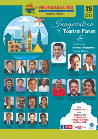 ലണ്ടന് : വേള്ഡ് മലയാളി കൌണ്സില് ടൂറിസം ഫോറം ഉല്ഘാടനം കേരള ടൂറിസം മന്ത്രി മുഹമ്മദ് റിയാസ് സൂം പ്ലാറ്റ്ഫോമില് നിര്വഹിക്കുന്നു (മെയ് 26ന് ഉച്ച കഴിഞ്ഞു മൂന്നു മണിക്ക് യു കെ സമയം ,വൈകുന്നേരം 4മണി ജര്മന് സമയം, ഇന്ത്യന് സമയം വൈകുന്നേരം 7.30). ഇ എം നജീബ് (എക്സിക്യൂട്ടീവ് ഡയറക്ടര് കിംസ് ഹെല്ത്ത് ), പ്രസാദ് മഞ്ഞളി (എം. ഡി. സിട്രന് ), എസ് ശ്രീകുമാര് (ഏഷ്യാനെറ്റ് യു കെ, ആനന്ദ് ടി വി ), ഗോപാല പിള്ള (ഡെബ്ലി യു എംസി ഗ്ലോബല് ചെയര്മാന് ), ജോണ് മത്തായി (പ്രസിഡന്റ് ഡബ്ലിയു എം സി ഗ്ലോബല് ), പിന്റോ കണ്ണംപ്പിള്ളി (ജനറല് സെക്രട്ടറി ഡബ്ലിയു എം സി ഗ്ലോബല് ), സാം ഡേവിഡ് മാത്യു (ട്രെഷരാര് ഡബ്ലിയു എം സി ഗ്ലോബല് ), ഗ്രിഗറി മേടയില് (വൈസ് ചെയര്മാന് ഡബ്ലിയു എം സി ഗ്ലോബല് ), തോമസ് അറബന്കുടി (വൈസ് പ്രസിഡന്റ് ഡബ്ലിയു എം സി ഗ്ലോബല് ), മേഴ്സി തടത്തില് (ഡബ്ലിയു എം സി വൈസ് ചെയര്പേഴ്സണ് ), തോമസ് കണ്ണന്കേരില് (ഡബ്ലിയു എം സി ടൂറിസംഫോറം പ്രസിഡന്റ്), ജോണ്സണ് തലച്ചല്ലുര് (പ്രസിഡന്റ് അമേരിക്കന് റീജിയന് ), ഷൈന് ചന്ദ്രസേനന് (പ്രസിഡന്റ് മിഡില് ഈസ്റ്റ് റീജിയന് ), ജോളി തടത്തില് (ചെയര്മാന് യൂറോപ്പ് റീജിയന് ),ജോളി എം പടയാട്ടില് (പ്രസിഡന്റ് യൂറോപ്പ് റീജിയന് ), ബാബു തോട്ടാപ്പിള്ളി (ജനറല് സെക്രട്ടറി യൂറോപ്പ് റീജിയന്), അബ്ദുല് ഹക്കിം (പ്രസിഡന്റ് എന് ആര് കെ ഫോറം ), ചെറിയാന് ടി കീക്കാട് (പ്രസിഡന്റ് ബിസിനസ് ഫോറം ),ഡോ. വിജയലക്ഷ്മി (ചെയര്മാന് ഇന്ത്യന് റീജിയന് ), ഡോ. അജില് അബ്ദുള്ള (ജനറല് സെക്രട്ടറി ഇന്ത്യന് റീജിയന് )തുടങ്ങിയവര് പങ്കെടുക്കും.