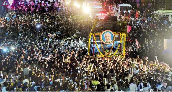 19 വര്ഷം മുമ്പ് അച്ഛന് മരിച്ചപ്പോഴും ഇതുപോലൊരു വിലാപയാത്ര കേരളം കണ്ടു. ഇതൊക്കെ ജനം നല്കുന്നൊരു ബഹുമതിയാണ്. ഇതൊന്നും ആരും നിര്ബന്ധിച്ചിട്ടോ പറഞ്ഞിട്ടോ ചെയ്യുന്നതല്ല. അവരൊരു കടലുപോലെ, ഉള്ളിന്റെ ഉള്ളില്നിന്ന് ഒഴുകി വരുന്നതാണ്. എത്രപേര്ക്ക് കിട്ടുന്നു, കൊടുക്കുന്നു എന്നത് ജനത്തിന്റെ മനസിലുള്ള കാര്യമാണ്. ഒരു പ്ലാറ്റ്ഫോമില് നമുക്കതിനെ കൊണ്ടുവരാന് പറ്റില്ല. ഇനിയുള്ള രാഷ്ട്രീയക്കാര് ഉമ്മന്ചാണ്ടി സാറാവാന് ശ്രമിക്കുക', അദ്ദേഹം കൂട്ടിച്ചേര്ത്തു.