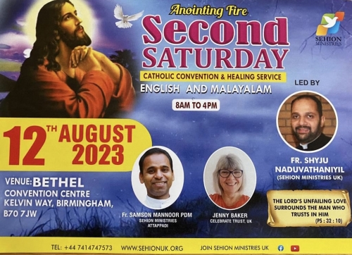 അഭിഷേകാഗ്നി രണ്ടാം ശനിയാഴ്ച ബൈബിള് കണ്വെന്ഷന് ആഗസ്റ്റ് 12 ന് ബര്മിങ്ഹാം ബെഥേല് സെന്റെറില് നടക്കും. ഫാ.സേവ്യര് ഖാന് വട്ടായില് ആത്മീയ നേതൃത്വം നല്കുന്ന അഭിഷേകാഗ്നി കാത്തലിക് മിനിസ്ട്രിയുടെ നേതൃത്വത്തില് നടക്കുന്ന കണ്വെന്ഷനില് ഇത്തവണ പ്രശസ്ത ധ്യാനഗുരുവും അട്ടപ്പാടി സെഹിയോന് ധ്യാനകേന്ദ്രത്തിലെ ആത്മീയ വചന പ്രഘോഷകനുമായ ഫാ.സാംസണ് മണ്ണൂര് ഫാ ഷൈജു നടുവത്താനിയിലിനൊപ്പം കണ്വെന്ഷന് നയിക്കും . യൂറോപ്പിലെ പ്രമുഖ ആത്മീയ ശുശ്രൂഷക ജെന്നി ബേക്കര് ഇംഗ്ലീഷ് കണ്വെന്ഷനില് പങ്കെടുക്കും . 2009 ല് ഫാ. സോജി ഓലിക്കല് തുടക്കമിട്ട സെഹിയോന് യുകെ രണ്ടാം ശനിയാഴ്ച്ച കണ്വെന്ഷന് 2023 മുതല് ഫാ സേവ്യര് ഖാന് വട്ടായിലിന്റെ ആത്മീയ നേതൃത്വത്തില് അഭിഷേകാഗ്നി എന്ന പേരിലാണ് പതിവുപോലെ എല്ലാ രണ്ടാം ശനിയാഴ്ച്ചകളിലും നടത്തപ്പെടുന്നത് .