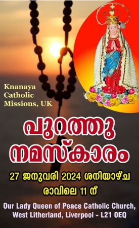 മൂന്ന് നോമ്പിനോട് അനുബന്ധിച്ച് ക്നാനായക്കാരുടെ ചരിത്രപ്രസിദ്ധമായ പ്രാര്ത്ഥനാ രീതിയായ പുറത്തു നമസ്കാരം യുകെ യില് നടത്തപ്പെടുവാന് ഇനി 21 ദിവസം മാത്രം. ക്നാനായ കാത്തലിക് മിഷന്സ് യുകെയുടെ നേതൃത്വത്തില് സെന്റ് മേരീസ് ക്നാനായ കാത്തലിക് മിഷന്, സെന്റ് തോമസ് കാത്തലിക് മിഷന്, സെന്റ് പയസ് ടെന്ത് മിഷന് എന്നിവയുടെ സംയുക്ത നേതൃത്വത്തില് ലിവര്പൂള് ആതിഥേയത്വം വഹിക്കുന്ന പുറത്തു നമസ്കാരം ഈമാസം 27ന് രാവിലെ 11 മുതല് നടത്തപ്പെടുന്നു. ലിവര്പൂളിലെ ഔര് ലേഡി ഓഫ് പീസ് ചര്ച്ചില് നിരവധി വൈദികരുടെ കാര്മികത്വത്തില് വിശുദ്ധ കുര്ബാനയും അനുതാപത്തിന്റെയും കരുണയുടെയും പ്രാര്ത്ഥനയായ പുറത്തു നമസ്കാരം നടത്തപ്പെടുന്നു.