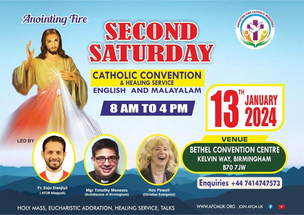പുതുവര്ഷത്തിലെ ആദ്യ അഭിഷേകാഗ്നി രണ്ടാം ശനിയാഴ്ച കണ്വെന്ഷന് ജനുവരി13ന് ബര്മിങ്ഹാം ബെഥേല് സെന്റെറില് നടക്കും . അട്ടപ്പാടി സെഹിയോന് ധ്യാനകേന്ദ്രത്തിലെ പ്രശസ്ത വചന പ്രഘോഷകന് ഫാ.സാജു ഇലഞ്ഞിയില് കണ്വെന്ഷന് നയിക്കും. ബര്മിങ്ഹാം അതിരൂപതയിലെ മോണ്. തിമൊത്തി മെനെസിസ്, പ്രമുഖ സുവിശേഷ പ്രവര്ത്തക റോസ് പവല് എന്നിവരും കണ്വെന്ഷനില് പങ്കെടുക്കും.