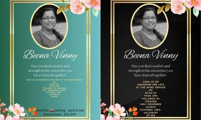 ചടങ്ങില് പങ്കുചേരാന് എത്തുന്നവര് പ്രതീക്ഷിച്ചതിലും അധികമായാല് പാര്ക്ക് ആന്റ് റൈഡ് ബിഷപ്പ്ഡൗണില് പാര്ക്കിംഗ് സൗകര്യവും ഒരുക്കിയിട്ടുണ്ട്. ജനുവരി 23-ാം തീയതി രാത്രിയാണ് സാലിസ്ബറി ജനറല് ഹോസ്പിറ്റലില് വച്ച് ബീന മരണത്തിനു കീഴടങ്ങിയത്. ഏതാനും നാളുകളായി ചികിത്സയിലായിരുന്നുവെങ്കിലും അസുഖം മൂര്ച്ഛിച്ചതിനെ തുടര്ന്ന് ഹോസ്പിറ്റലില് എത്തിക്കുകയും അവിടെ വച്ച് മരണം സംഭവിക്കുകയും ആയിരുന്നു.