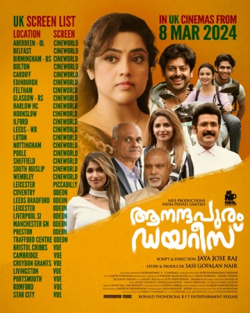 കേരളത്തില് പ്രേക്ഷകശ്രദ്ധയും മാധ്യമ ശ്രദ്ധയും പിടിച്ചു പറ്റി രണ്ടാം വാരത്തിലേക്ക് കടക്കുന്ന ആനന്ദപുരം ഡയറീസ് മാര്ച്ച് 8-ാം തീയതി യു.കെയില് തീയേറ്ററുകളില് പ്രദര്ശനം തുടങ്ങി . ഏറെ സമകാലീന പ്രാധാന്യമുള്ള സാമൂഹിക വിഷയങ്ങള് ചര്ച്ച ചെയ്യുന്ന ആനന്ദപുരം ഡയറീസ് ഇപ്പോള് മലയാളീ സമൂഹം ഏറെ ഗൗരവത്തോടെയാണ് വീക്ഷിക്കുന്നത്. ഈയിടെ ഏറെ കോളിളക്കം സൃഷ്ടിച്ച സിദ്ധാര്ത്ഥന് എന്ന വിദ്യാര്ത്ഥിയെ മര്ദ്ദിച്ചു കൊന്ന പൂക്കോട്ട് വെറ്റിനറി കോളേജിലാണ് സിനിമയുടെ ഭൂരിഭാഗവും ചിത്രീകരിച്ചത്.