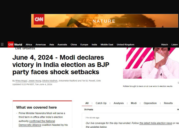 മോദി വിജയിച്ചെങ്കിലും, ബി ജെ പിക്ക് ഒറ്റക്ക് ഭൂരിപക്ഷം ലഭിക്കാതെ പോയതാണ് സി എന് എന്നും എടുത്ത് പറയുന്നത്. 400 സീറ്റിലധികം ലഭിക്കുമെന്ന് അവകാശവാദം മുഴക്കിയ മോദിക്ക് ഇപ്പോള് സഖ്യകക്ഷികളുടെ പിന്തുണയില്ലാതെ ഭരിക്കാന് ആകാത്ത സാഹചര്യമാണെന്നും റിപ്പോര്ട്ടില് ചൂണ്ടിക്കാണിക്കുന്നു. മാത്രമല്ല, എഴുതിത്തള്ളിയിരുന്ന കോണ്ഗ്രസ്സിന്റെ ഉയര്ത്തെഴുന്നേല്പും അവര് ചര്ച്ചയാക്കുന്നു. , 'മോദി, അംബാനി , അദാനി- ഇന്ത്യന് സമ്പദ്ഘടന രൂപപ്പെടുത്തുന്ന ത്രിമൂര്ത്തികള്' എന്ന പേരില് വിശദമായ ഒരു വിശകലന കുറിപ്പും ഇവര് പ്രസിദ്ധീകരിച്ചിട്ടുണ്ട്. എന്തായാലും മോദിയുടെ താന്പ്രമാണിത്തം അവസാനിച്ചതായി വിദേശ മാധ്യമങ്ങള് ഒരുപോലെ പറയുന്നു