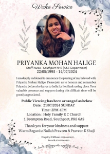 ലങ്കാഷെയര് ടീച്ചിങ് ഹോസ്പിറ്റലില് നഴ്സ് ആയി ജോലി ചെയ്തിരുന്ന പ്രിയങ്ക വെയ്ല്സില് യാത്രയ്ക്കിടെ മരണപെട്ടു എന്നാണ് കുടുംബം അറിയിക്കുന്നത്. ദിവസങ്ങള്ക്ക് മുന്പുണ്ടായ മരണത്തെ തുടര്ന്നു ഇപ്പോള് പോലീസ് പോസ്റ്റ്മോര്ട്ടം നടപടികള് പൂര്ത്തിയാക്കി മൃതദേഹം ബന്ധുക്കള്ക്കു വിട്ടു നല്കിയിരിക്കുകയാണ്. സൗത്തപോര്ട്ടില് പ്രിയപ്പെട്ടവര്ക്കായി ആദരാഞ്ജലി അര്പ്പിക്കുന്നതിനായി പൊതുദര്ശന സൗകര്യം ഒരുക്കിയിട്ടുണ്ട്. തുടര്ന്ന് ഏറ്റവും വേഗത്തില് പ്രിയങ്കയുടെ മൃതദേഹം നാട്ടില് എത്തിച്ചു ആചാരപൂര്വമുള്ള സംസ്കാര ചടങ്ങുകള് പൂര്ത്തിയാകും.