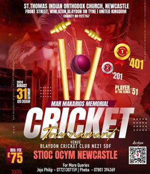 ന്യൂകാസില് ബ്ലെയ്ഡണ് ഓണ് ടൈനിലെ സെന്റ് തോമസ് ഇന്ത്യന് ഓര്ത്തഡോക്സ് ചര്ച്ച് ഒസിവൈഎം സംഘടിപ്പിക്കുന്ന ആദ്യ ക്രിക്കറ്റ് ടൂര്ണമെന്റ് മറ്റന്നാള് 31-ാം തീയതി ശനിയാഴ്ച നടക്കും. നോര്ത്ത് ഇംഗ്ലണ്ടിലെയും സ്കോട്ട്ലന്ഡിലെയും ഓര്ത്തഡോക്സ് ചര്ച്ചുകളെ ഉള്പ്പെടുത്തി ബ്ലെയ്ഡണ് ക്രിക്കറ്റ് ക്ലബ്ബില് നടക്കുന്ന ടൂര്ണമെന്റ് രാവിലെ ഒന്പതു മണിക്കാണ് ആരംഭിക്കുക. മുന് ഭദ്രാസന മെത്രാപ്പോലീത്തയായിരുന്ന എല്.എല്.ഡോ. തോമസ് മാര് മക്കാറിയോസിന്റെ സ്മരണാര്ത്ഥമാണ് ഈ ടൂര്ണമെന്റ് നടത്തുന്നത്.