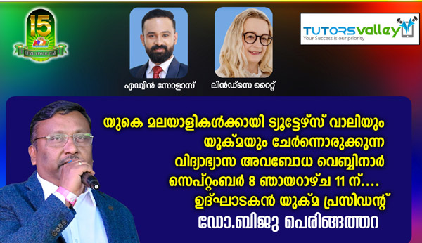 യുക്മയും യുകെയിലെ പ്രമുഖ യുകെ വിദ്യാഭ്യാസ സേവന ദാതാക്കളായ ട്യൂട്ടേഴ്സ് വാലിയും ചേര്ന്ന് യുകെയിലേക്ക് പുതുതായി കുടിയേറിയവര്ക്കും പഴയ തലമുറയിലെ കുടിയേറ്റക്കാര്ക്കും പ്രയോജനകരമാകുന്ന വിധത്തില് യുകെയില് പ്രൈമറി തലം മുതല് യൂണിവേഴ്സിറ്റി തലം വരെയുള്ള വിദ്യാഭ്യാസ സംവിധാനത്തെപ്പറ്റിയും, അവസരങ്ങളെപ്പറ്റിയും, വിവിധ കോഴ്സുകളും അവയിലേക്ക് പഠനം തെരഞ്ഞെടുക്കേണ്ടുന്ന രീതിയെപ്പറ്റിയും വിശദമായി പ്രതിപാദിക്കുന്ന വിദ്യാഭ്യാസ വെബിനാര് സെപ്റ്റംബര് 8 ന് സംഘടിപ്പിച്ചിരിക്കുന്നു. നാട്ടിലെ രീതിയില് നിന്നും തികച്ചും വിഭിന്നമായ വിദ്യാഭ്യാസ സംവിധാനങ്ങള് നിലവിലുള്ള ബ്രിട്ടനില് അഞ്ജത മൂലം പലപ്പോഴും ശരിയായ കോഴ്സുകള് തിരഞ്ഞെടുക്കാനോ, കുട്ടികളുടെ അഭിരുചികള്ക്ക് അനുസരിച്ച് വേണ്ട മാര്ഗ്ഗ നിര്ദ്ദേശങ്ങള് നല്കുവാനോ മാതാപിതാക്കള്ക്ക് പലപ്പോഴും സാധിക്കാതെ വരുന്ന സാഹചര്യവും മനസ്സിലാക്കിയാണ് യുക്മയും ട്യൂട്ടേഴ്സ് വാലിയും ചേര്ന്ന് ഇത്തരത്തില് ഒരു വെബ്ബിനാര് സംഘടിപ്പിക്കുന്നത്.