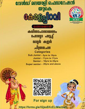 ലണ്ടന്: നവംബര് ഒന്ന് കേരളപ്പിറവി ദിനത്തോടനുബന്ധിച്ച് കേരളീയം 2024' എന്ന പേരില് വേള്ഡ് മലയാളി ഫെഡറേഷന് യുകെ(ഡബ്ല്യുഎംഎഫ് യുകെ) മത്സരങ്ങള് സംഘടിപ്പിക്കുന്നു. കവിതാ പാരായണം, ഫോട്ടോഷൂട്ട്, വാട്ടര് കളര്, ചിത്രരചന എന്നീ മത്സരങ്ങളാണ് ഒരുക്കുന്നത്. വിവിധ പ്രായവിഭാഗങ്ങളില് മത്സരങ്ങള് സംഘടിപ്പിച്ചിരിക്കുന്ന ഈ പരിപാടി, എല്ലാ പ്രായക്കാര്ക്കും പങ്കാളി ആവാനുള്ള മികച്ച അവസരമാണ്.