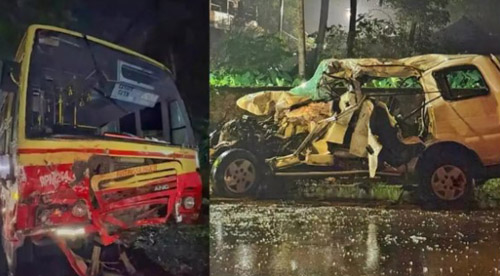 കാര് പൂര്ണമായും തകര്ന്നു. മുന് സീറ്റില് ഇരുന്ന രണ്ടുപേരും പിന് സീറ്റിലിരുന്ന മൂന്നുപേരുമാണ് മരിച്ചത്. കാര് വെട്ടിപ്പൊളിച്ചാണ് ഇവരെ പുറത്തെടുത്തത്. കെഎസ്ആര്ടിസി ബസിന്റെ മുന്സീറ്റിലിരുന്ന യാത്രക്കാര്ക്കും പരിക്കേറ്റു. അപകടത്തെ തുടര്ന്ന് ദേശീയപാതയിലൂടെയുള്ള ഗതാഗതം മണിക്കൂറുകളോളം നിലച്ചു.