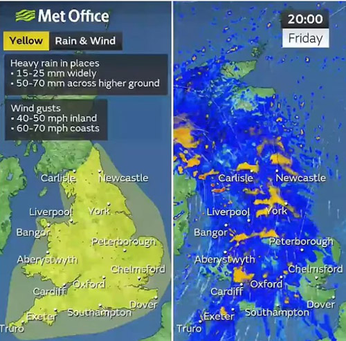 മഴ, കാറ്റ് എന്നിവയുമായി ബന്ധപ്പെട്ട മഞ്ഞ ജാഗ്രത ഇംഗ്ലണ്ടിലും, വെയില്സിലും, നോര്ത്തേണ് ഇംഗ്ലണ്ടിലുമാണ് പുറപ്പെടുവിച്ചിട്ടുള്ളത്. വെള്ളിയാഴ്ച ഉച്ചയ്ക്ക് 3 മുതല് ഞായറാഴ്ച രാവിലെ 6 വരെയാണ് മുന്നറിയിപ്പ് നിലവിലുള്ളത്. ആഴത്തിലുള്ള കുറഞ്ഞ പ്രഷര് സിസ്റ്റത്തിന് ഡറാഗ് കൊടുങ്കാറ്റെന്ന് പേര് നല്കും .