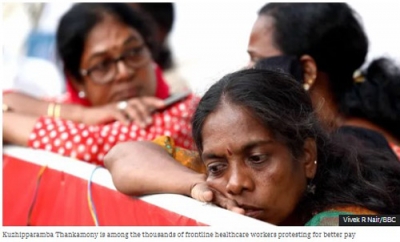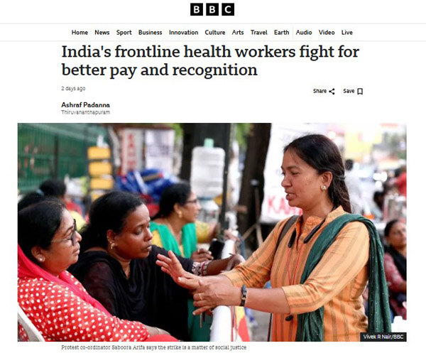 ആശവര്ക്കര്മാര് തങ്ങളുടെ വിവിധ ആവശ്യങ്ങള് ഉന്നയിച്ച് തിരുവനന്തപുരത്തെ സെക്രട്ടറിയേറ്റിന് മുന്നില് ഒരു മാസത്തിലധികമായി സമരം ചെയ്യുകയാണ്. സര്ക്കാര് ഇവരുമായി ചര്ച്ചക്ക് തയ്യാറാകുന്നില്ല എന്ന് മാത്രമല്ല പല പ്രമുഖ സി.പി.എം നേതാക്കളും സമരം ചെയ്യുന്നവരെ അധിക്ഷേപിച്ച് സംസാരിക്കുകയും ചെയ്തിരുന്നു. സമരം ഒത്തുതീര്പ്പായില്ലെങ്കില് അടുത്തയാഴ്ച സെക്രട്ടറിയേറ്റ് വളയാന് ആശാ പ്രവര്ത്തകര് തീരുമാനിച്ച കാര്യവും ബി.ബി.സി റിപ്പോര്ട്ടില് ചൂണ്ടിക്കാട്ടുന്നു. രാജ്യത്ത് പത്ത് ലക്ഷത്തിലധികം ആശാ വര്ക്കര്മാരാണ് ജോലി ചെയ്യുന്നത്. കഴിഞ്ഞ ദിവസം തിരുവനന്തപുരത്തെ എം.പിയായ ഡോ.ശശി തരൂര് സമരക്കാരെ അണ്സങ് ഹീറോസ് എന്ന് വിശേഷിപ്പിച്ച കാര്യവും ബി.ബി.സി റിപ്പോര്ട്ടില് പറയുന്നു.