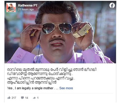 'രാവിലെ മുതല് മൂന്നാല് പേര് വിളിച്ചു. ഞാന് ലീഗലി ഡിവോഴ്സ്ഡ് ആണോ എന്നു ചോദിക്കുന്നു. എന്നാ പിന്നെ പറഞ്ഞേക്കാം എന്നു വച്ചു. ആഹ്ലാദിപ്പിന് ആനന്ദിപ്പിന് അതെ, നിയമപരമായി സിങ്കിള് മദര് ആണ്. ഒറിജിനല് രേഖകള് ശാന്തി വക്കീലിന്റെ കയ്യിലുണ്ട്. (വെബ്സൈറ്റിലും ലഭ്യമാണ്. JFM coturന്റെയും കുടുംബ കോടതിയുടെയും കേസ് നമ്പര് അത്യാവശ്യക്കാര്ക്കു തരാം)'