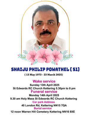 കെറ്ററിംഗ്: വീട്ടില് ഭാര്യയും മക്കളുമായി സംസാരിച്ചിരിക്കെ പൊടുന്നനെ കുഴഞ്ഞുവീണ് മരണത്തിനു കീഴടങ്ങിയ കെറ്ററിംഗിലെ ഷൈജു ഫിലിപ്പിന്റെ സംസ്കാരം തിങ്കളാഴ്ച (14ന്) നടക്കും. 13ന് വൈകിട്ട് 5.30 മുതല് എട്ടു മണി വരെ കെറ്ററിംഗിനെ സെന്റ് എഡ്വാര്ഡ്സ് ആര്സി ചര്ച്ചില് പൊതുദര്ശനം നടക്കും. തുടര്ന്ന് 14ന് രാവിലെ ഒന്പതുമണിയ്ക്ക് ജപമാലയും 9.30ന് വിശുദ്ധ കുര്ബാനയും നടത്തി ഉച്ചയ്ക്ക് 12 മണിയോടെ കെറ്ററിംഗ് വാറെന് ഹില് സെമിത്തേരിയില് സംസ്കാരവും നടക്കും. വേക്ക് സര്വ്വീസില് മാത്രമായിരിക്കും ഷൈജുവിനെ കുറിച്ചുള്ള ഓര്മ്മകള് പങ്കുവയ്ക്കുവാനും അനുശോചനം രേഖപ്പെടുത്തുവാനും വ്യക്തികള്ക്കും അസോസിയേഷനുകള്ക്കും ഇടവകകള്ക്കും സാധ്യമാകുകയെന്ന് കുടുംബം അറിയിച്ചു.