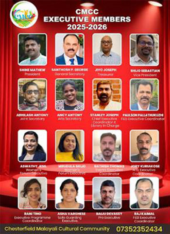 യുകെയില് ചെസ്റ്റര് ഫീല്ഡ് ആസ്ഥാനമായി സാമൂഹിക കലാ സംഘടനയായ സി.എം.സി.സിയുടെ 2025-26 ലേക്കുള്ള പുതിയ എക്സിക്യൂട്ടീവ് ഭാരവാഹികളെ കഴിഞ്ഞ ദിവസം പൊതുയോഗം ചേര്ന്ന് തിരഞ്ഞെടുത്തു. സമൂഹത്തിന്റെ നന്മക്കു വേണ്ടിയും, കലാസാംസ്കാരിക രംഗത്തെ മികവുറ്റ പ്രവര്ത്തനങ്ങള് കൊണ്ട് സാധാരണക്കാരുടെ ഒരു സ്നേഹകൂട്ടായ്മയായി ഇതിനോടകം തന്നെ സി.എം.സി.സി മാറികഴിഞ്ഞു.