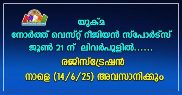 യുക്മ നോര്ത്ത് വെസ്റ്റ് റീജിയണ് സങ്കടിപ്പിക്കുന്ന യുക്മ നോര്ത്ത് വെസ്റ്റ് റീജിയണ് കായികമേളയുടെ രജിസ്ട്രേഷന് നാളെ അവസാനിക്കുന്നു. ലിവര്പൂള് മലയാളി അസോസിയേഷന് (ലിമ) ആതിഥേയത്വം വഹിക്കുന്ന യുക്മ നോര്ത്ത് വെസ്റ്റ് റീജിയണ് കായികമേള ജൂണ് 21ന് ലിവര്പൂളിലെ ലിതെര്ലാന്ഡ് സ്പോര്ട്സ് പാര്ക്കില് (Litherland Sports Park, Boundary Rd, Litherland, Liverpool L21 7LA) വച്ച് നടത്തപ്പെടുന്നു.
