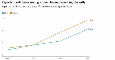 യുവാക്കളെക്കാള് യുവതികളിലാണ് മാനസിക പ്രശ്നങ്ങള് കൂടുതല് ഉള്ളത്. 16 മുതല് 24 വയസ് വരെ പ്രായമുള്ളവരില് ഇത്തരം അവസ്ഥകളുടെ നിരക്ക് ഒരു ദശാബ്ദത്തിനുള്ളില് വലിയ തോതില് വര്ധിച്ചതായി ആണ് സര്വേ ഫലം കാണിക്കുന്നത്. 2014 -ല് ഇത്തരം പ്രശ്നങ്ങള് ഉള്ളവരുടെ എണ്ണം 18.9 ശതമാനമായിരുന്നത് 2024 ആയപ്പോള് 25.8 ശതമാനമായി ഉയര്ന്നു. എന്നാല് മുതിര്ന്ന സ്ത്രീകളില് പാനിക് ഡിസോര്ഡര്, ഫോബിയകള്, ഒബ്സസീവ് കംപള്സീവ് ഡിസോര്ഡര് എന്നിവയും ഉള്പ്പെടുന്ന പ്രശ്നബാധിതരുടെ എണ്ണവും വളരെ കൂടിയിട്ടുണ്ട്. 36. 1 ശതമാനം സ്ത്രീകള് ആണ് ഈ മാനസിക പ്രശ്നങ്ങള് നേരിടുന്നതെന്ന് സര്വേയിലെ പ്രധാന ഗവേഷകരിലൊരാളായ സാലി മക്മാനസ് പറയുന്നു.