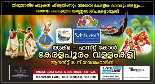 ഏഴാമത് യുക്മ - ഫസ്റ്റ് കോള് കേരളപൂരം വള്ളംകളിയുടെ ഒരുക്കങ്ങള് ദൃതഗതിയില് പുരോഗമിക്കുകയാണ്. റോഥര്ഹാമിലെ മാന്വേഴ്സ് തടാകത്തില് വെച്ച് ആഗസ്റ്റ് 30 ശനിയാഴ്ച നടക്കുന്ന വള്ളംകളി കാണുവാനെത്തുന്ന കായിക പ്രേമികള്ക്ക് ഹരം പകരുവാന് മലയാളത്തിന്റെ തനത് കലാരൂപങ്ങളും അരങ്ങേറുകയാണ്. വള്ളംകളിയോടൊപ്പം ദിവസം മുഴുവന് നീണ്ട് നില്ക്കുന്ന നിരവധി കലാപരിപാടികളാണ് അണിയറയില് ഒരുങ്ങിക്കൊണ്ടിരിക്കുന്നത്.